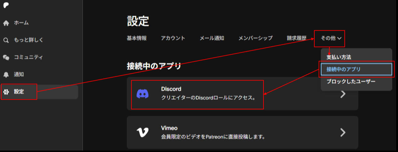 2.Patreonのサイト上で以下の図のボタンからDiscordとの接続を行います。